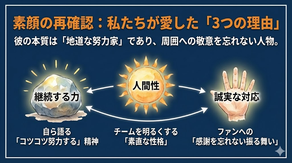 - ファンへの「誠実な対応」:キャンプ地などで見せた、感謝を忘れない振る舞い。