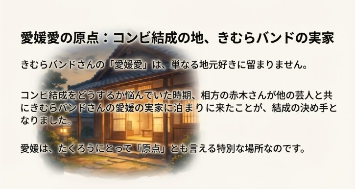 このように、コンビ結成の重要な局面でも「実家」がキーワードになっており、彼らにとって愛媛は特別な場所であることがわかります。
