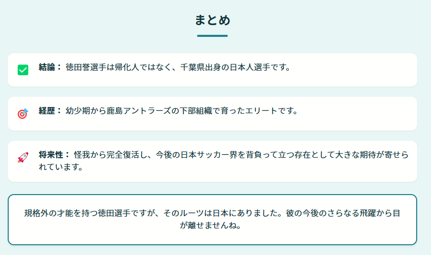 - 結論: 徳田誉選手は帰化人ではなく、千葉県出身の日本人選手です。