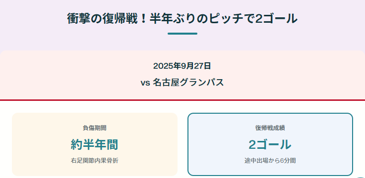 徳田選手は長期離脱を乗り越え、2025年9月27日の名古屋グランパス戦で約半年ぶりに復帰しました。